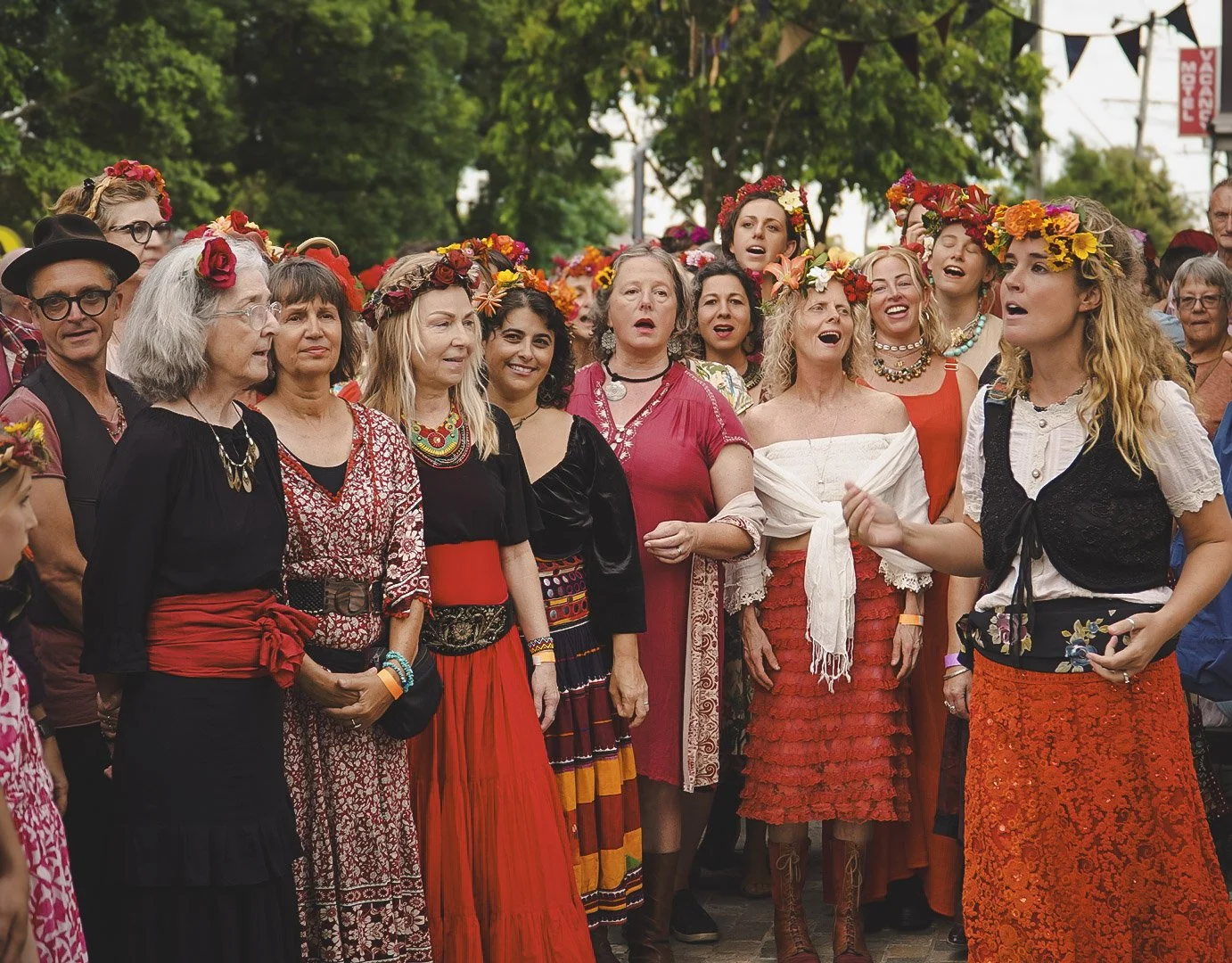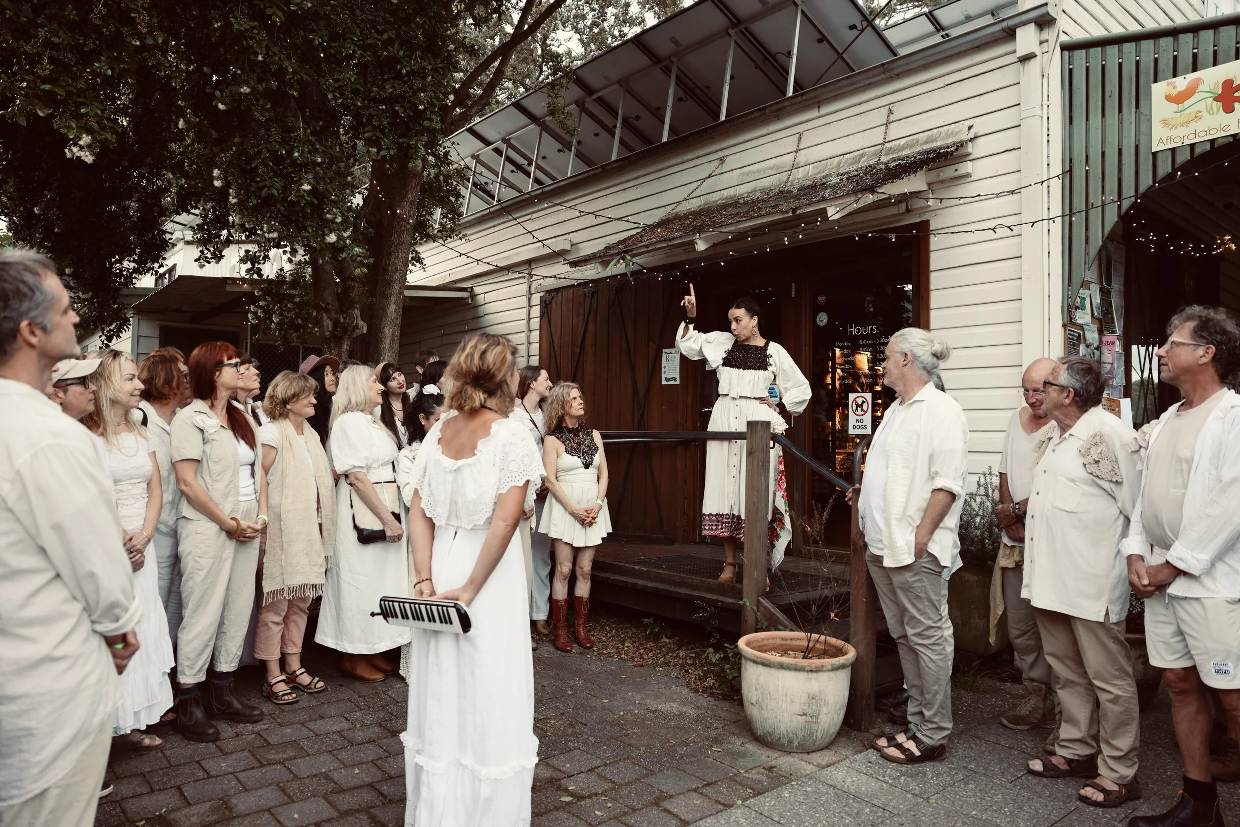 The Belonging Tour reimagined Bellingen’s streets as a living gallery of human stories. Led by The Bellingen Singers, audiences journeyed through town discovering community members stationed in unexpected locations, each sharing intimate stories of belonging through speech, song, dance, and visual art. Local residents became living artworks, sharing experiences of migration, gender identity, cultural heritage, disability, and connection to Country. The work transformed familiar streets into sites of vulnerability and revelation, creating space for diverse voices to be heard and witnessed.